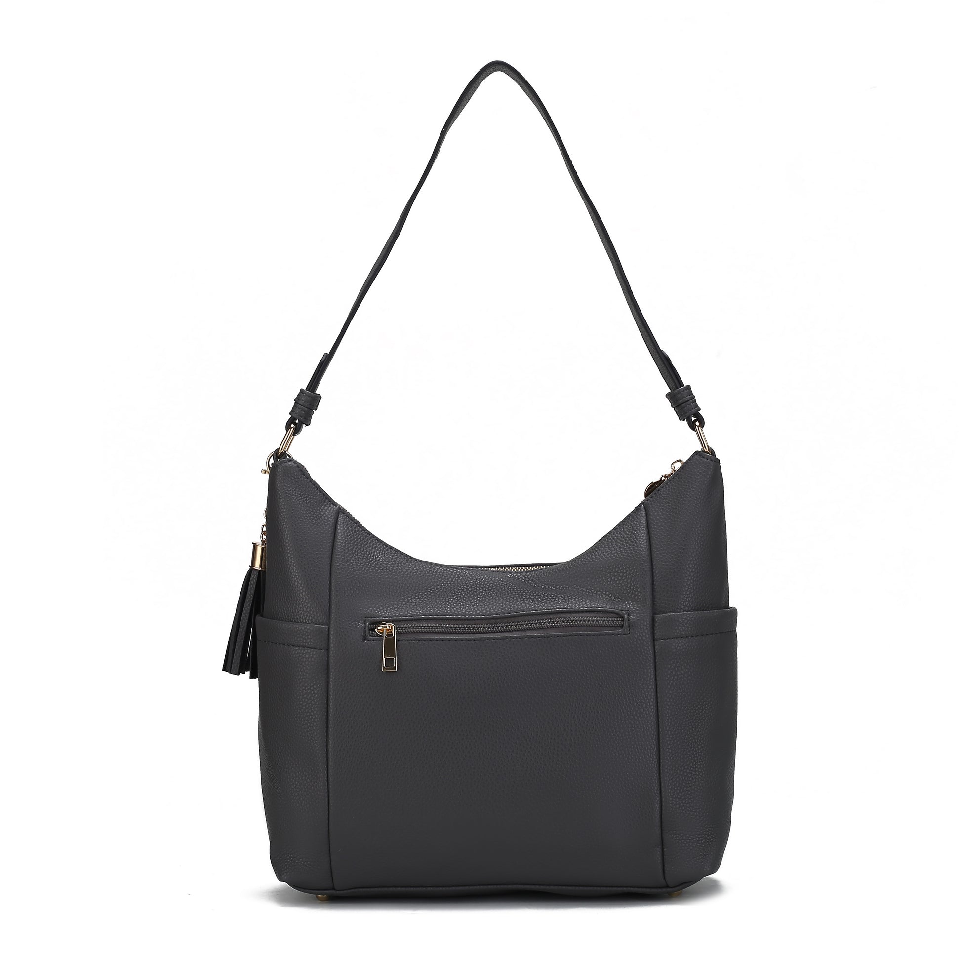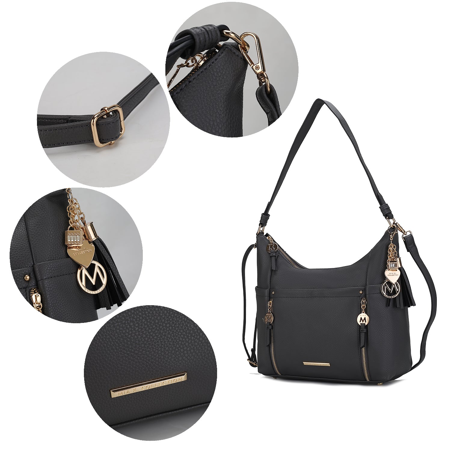 - Our Ruby shoulder bag is a softly structured style you’ll carry time and again. Crafted from pebbled vegan leather, this large carryall is spacious enough to hold all your essential items, making it the perfect everyday piece. Unzips the top zipper closure to reveal a fully lined interior with a zippered pocket and two slip pockets. The exterior features a convenient deep slip pocket on each side to hold other key items, a magnetic closure large pocket in the front, and a zippered back pocket in the back. Designed with gold-tone embellishments, there are two front zippers for decorative purposes with our zipper puller emblem on them. It comes also with a detachable key chain with our round emblem on it. Wear this style by the top handle, on your shoulder or attach the adjustable strap and carry it crossbody for hands-free ease. This style has a flat base and feet for stability. You will love our Ruby Shoulder Bag