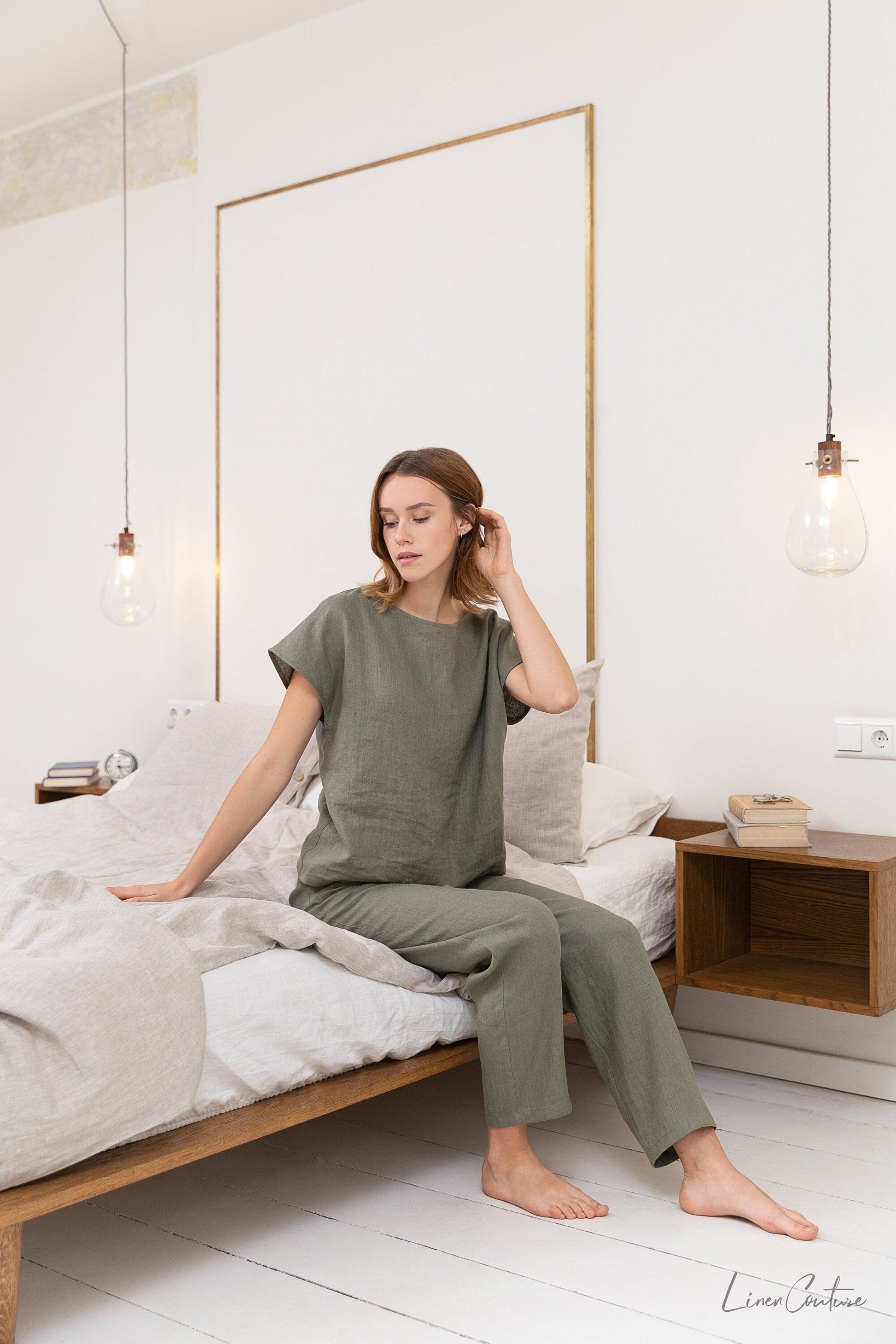 Safari green linen / Natural Linen Pajama set / Linen loungewear /