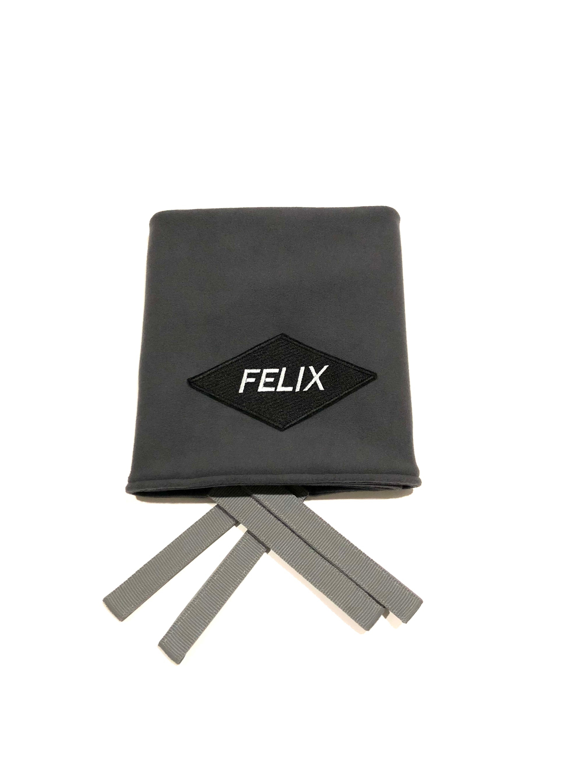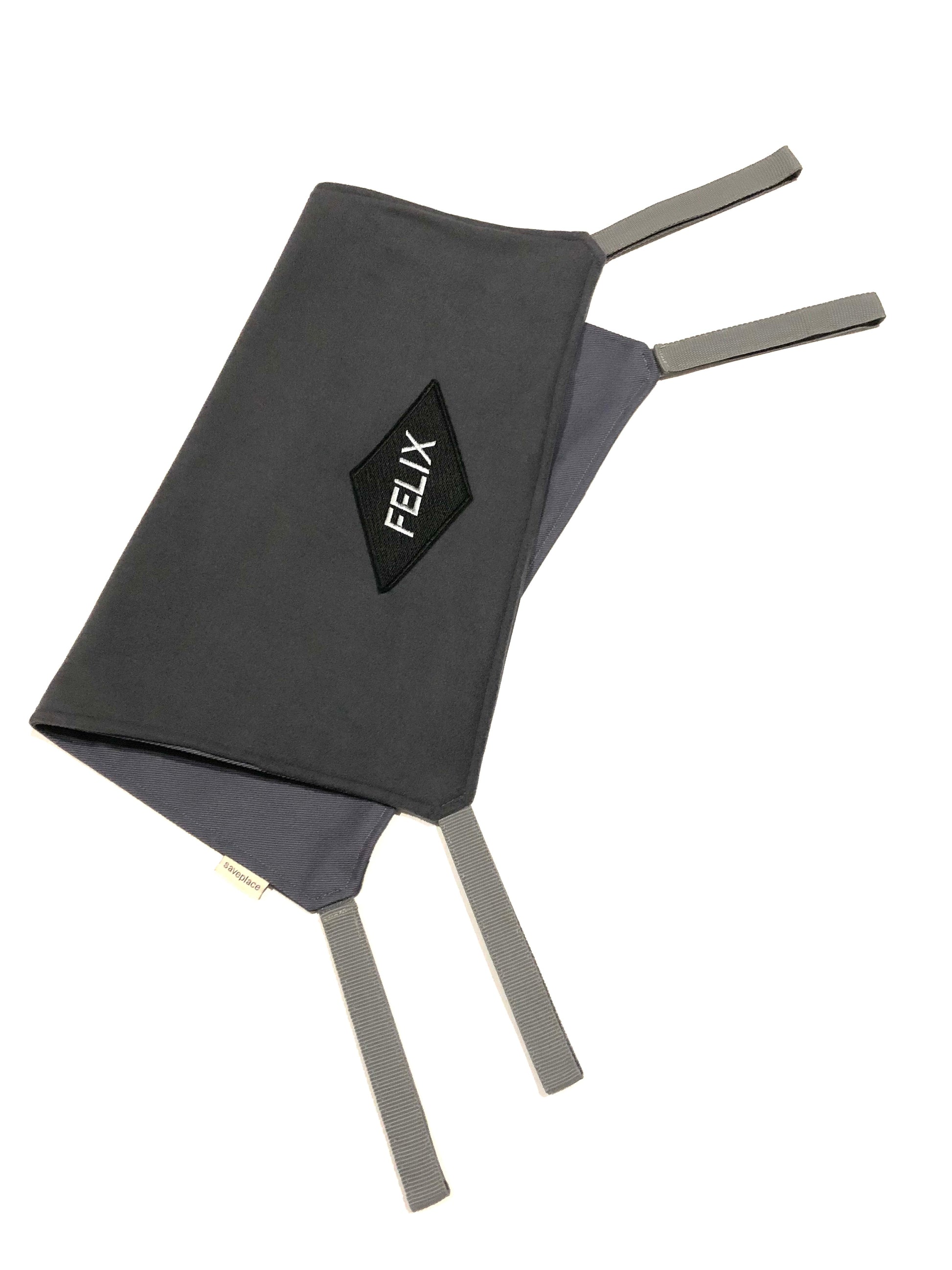 MATERIALS: cotton & fleece; light grey waterproof fabric. Both sides are used. Additional carabiners and oval loops also available.