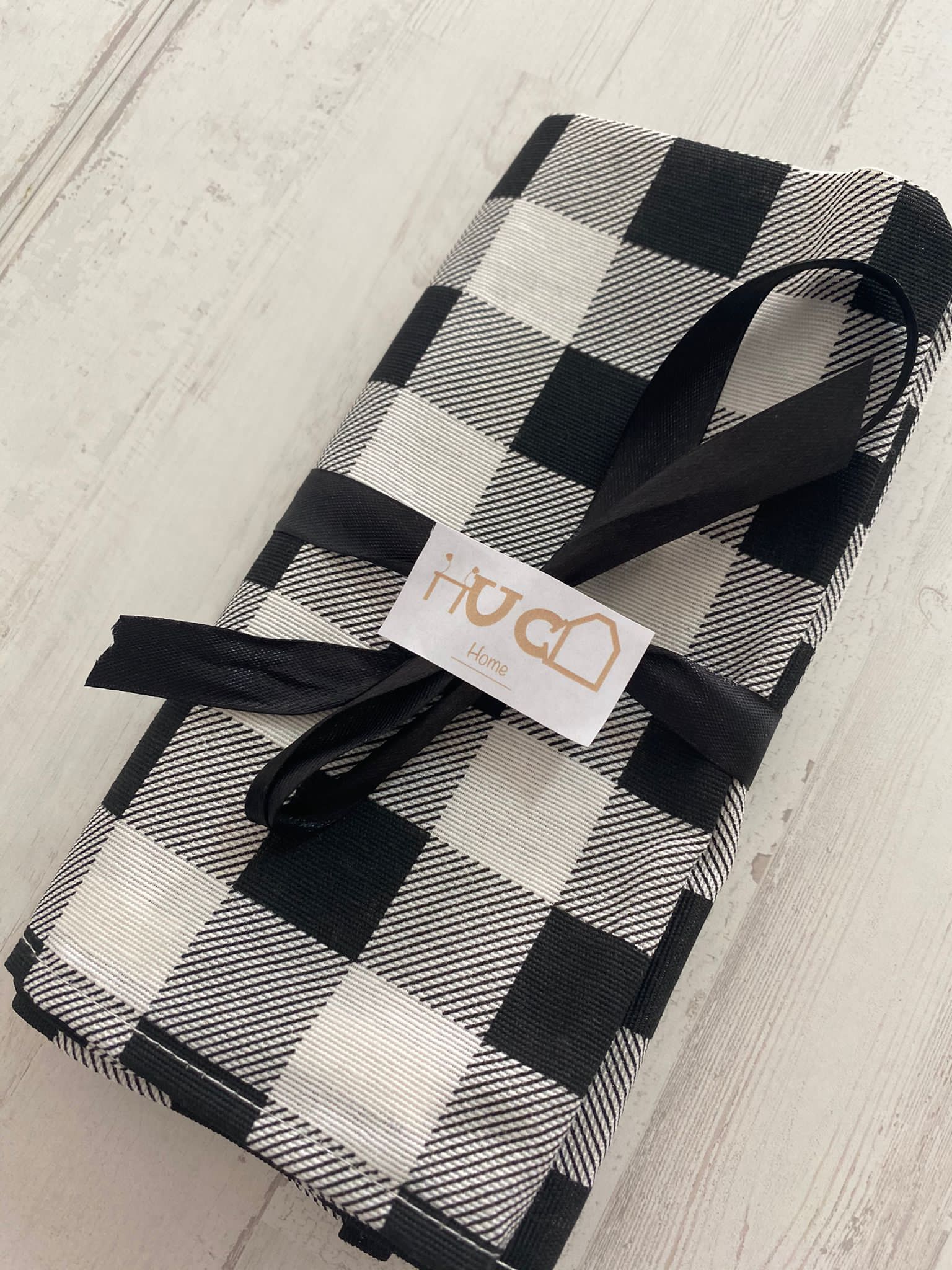 Высококачественные, мягкие, чёрные салфетки в крупную клетку в клетку. Эти салфетки изготовлены из прочного 100% хлопка и очень приятны на ощупь . Идеально подходят для обеденного стола или комплекта скатертей.