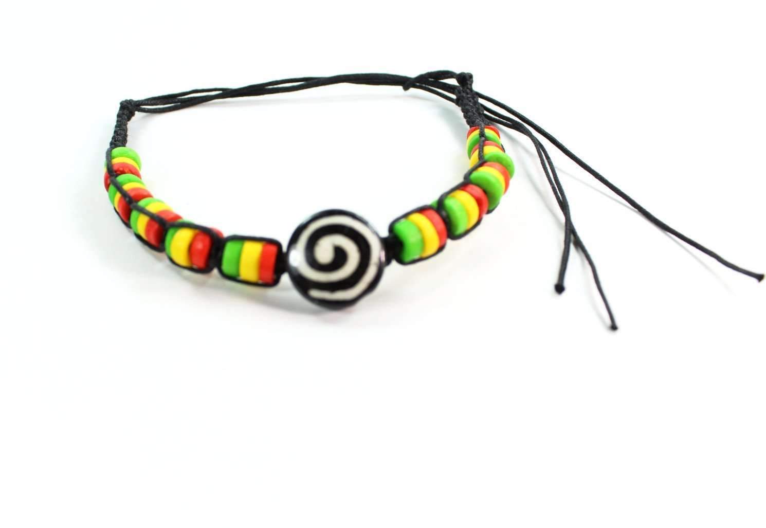 A tribal style friendship bracelet with a beautiful, glossy spiral centerpiece in bone! Colorful beads in festive Rasta style red, yellow and green accent, all perfectly hand-strung along a sturdy and adjustable, cotton cord.