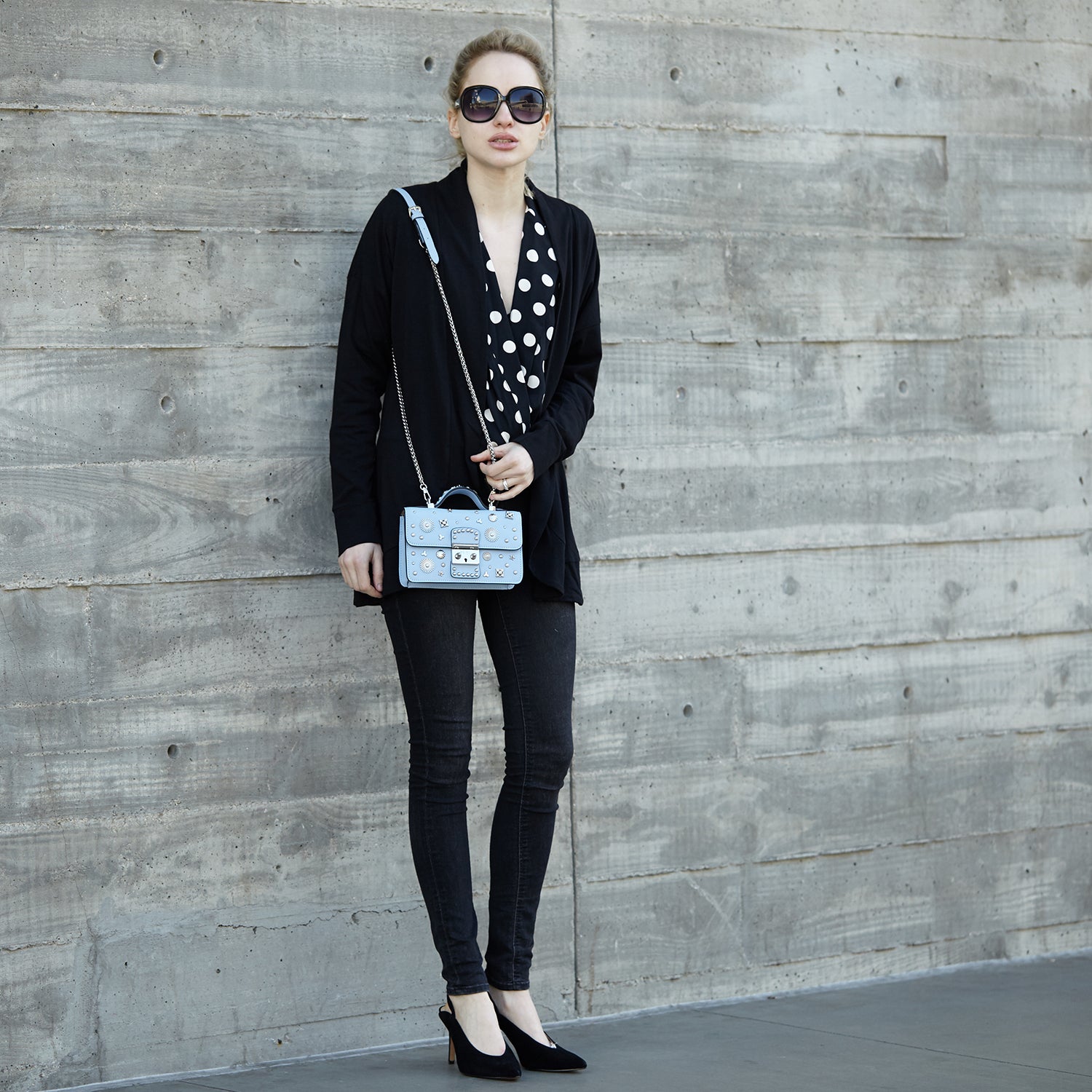 The stylish baby blue Hollywood is the perfect boxy mini purse with silver cool metal stud appliqués on the front of the bag and top handle. Secured by a polished silver metal push lock on the front flap, this structured trendy light blue leather bag with studs includes an interior zipped pocket and a slip pocket keeping all your essentials organized. Complimented with quirky silver metal hardware, the Hollywood’s leather top handle, adjustable and removable silver chain strap allows you to wear this cool bag by its handle, over the shoulder, or as a chic crossbody style, especially for those times your hands are busy texting.
