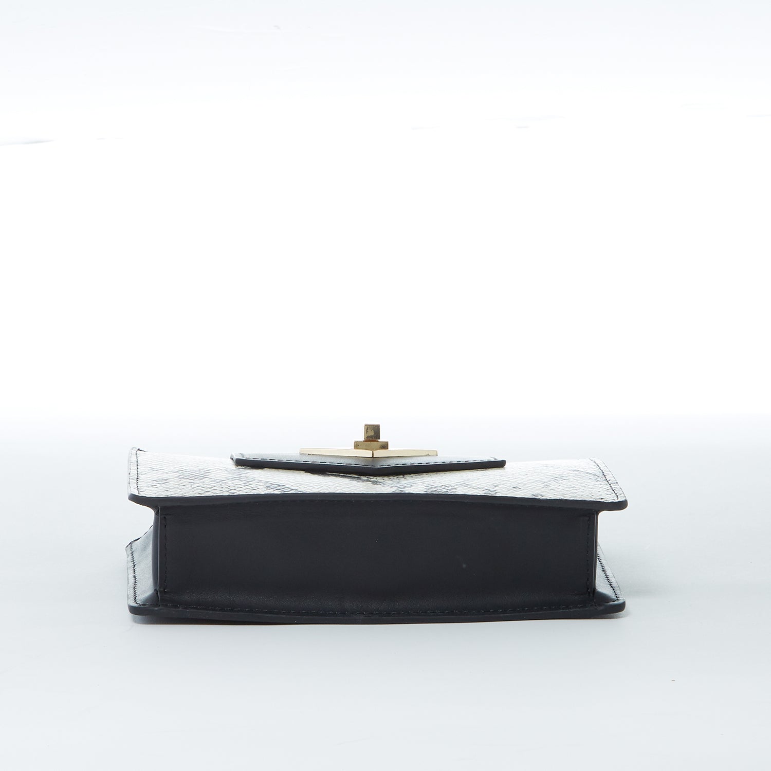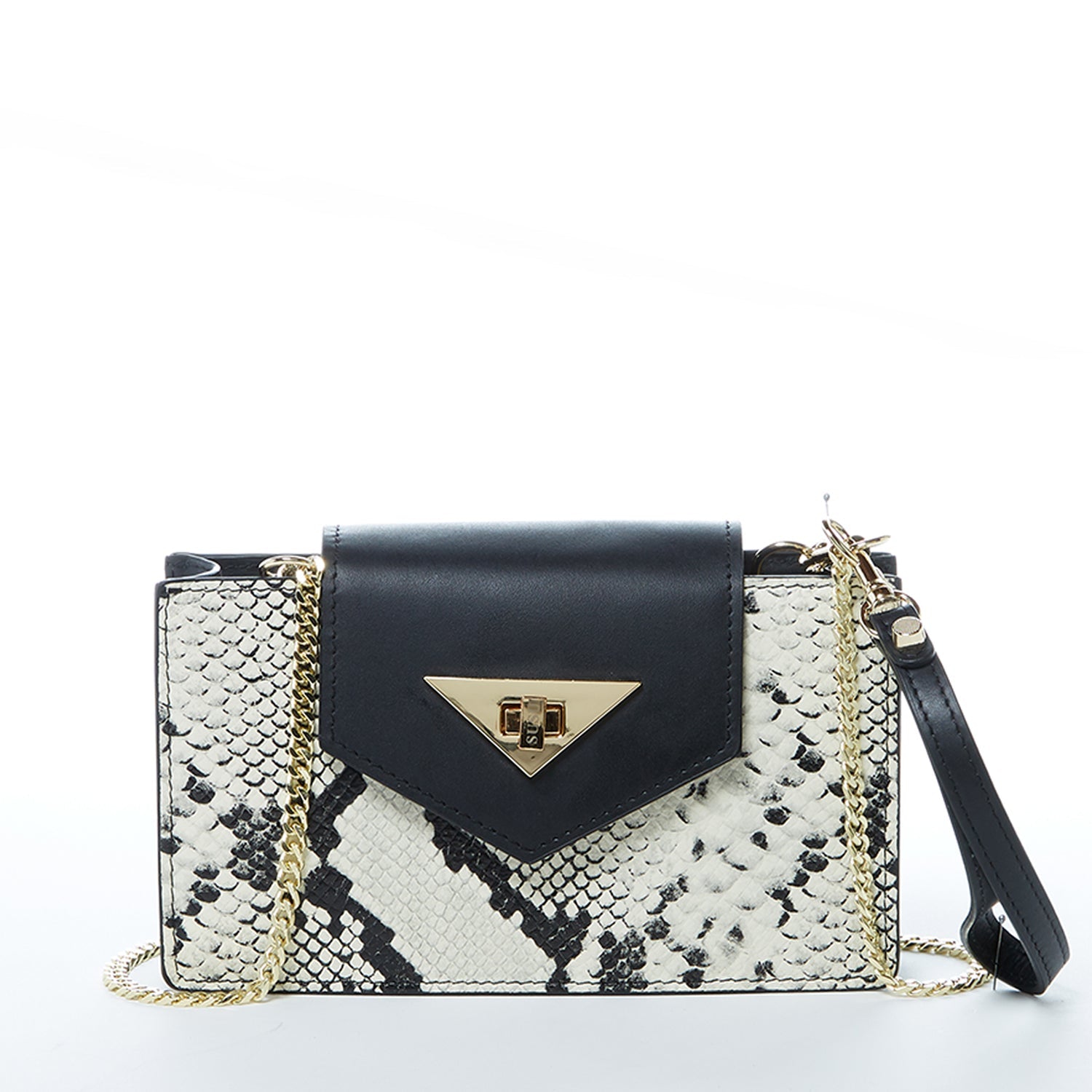 The Mary is a modern, geometric take on the classic crossbody wristlet. With a boxy structure and a sturdy, angular flap, this bag’s put together look will serve as a boost to your confidence. With a vivid animal print pattern broken up with a sleek triangle or luxury black leather, you are sure to feel stylish with the Mary on hand. A twist lock is placed sleekly within a statement piece of gold accent hardware to keep the flap in place. The sharp angles throughout the design of the python bag contribute to its refined look. This snakeskin black leather crossbody purse is accompanied by a luxurious gold chain as well as a wrist strap so you can wear it multiple ways. The Mary is a simultaneously a crossbody and wristlet that is perfect for keeping all your essentials organized with one zipper pocket and 6 credit card slots. Its spacious interior fits even the largest smartphone models.
