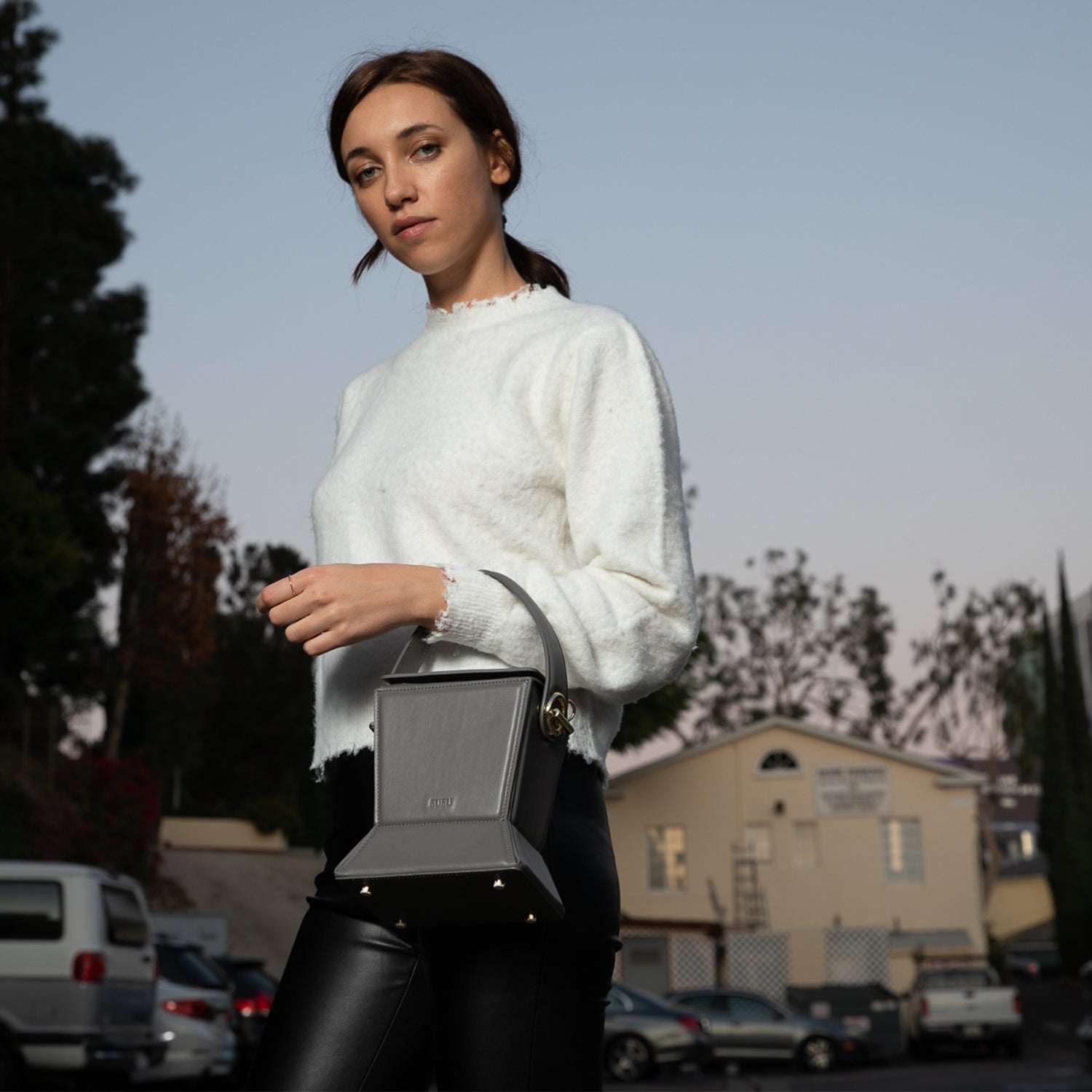 Make heads turn with The Tower, a truly one of a kind leather crossbody bag. It’s a must have for anyone that likes to stand out with unique purses. It has a modern geometric design that is complemented with smooth dark frost gray leather, light gold hardware, and a coffee cotton lining. This unique smoke gray leather bucket bag is more than just eye candy - it has a functional design with a strong double magnetic closure for easy access and folds out into a roomy accordion shape which you'll find a surprisingly spacious interior. It also comes with an adjustable and removable cross over strap, so you can wear it as a cross body purse or carry it by the top handle as a bucket barrel bag. However you decide to style it, this unique vase shape handbag will definitely take your outfit to the next level.