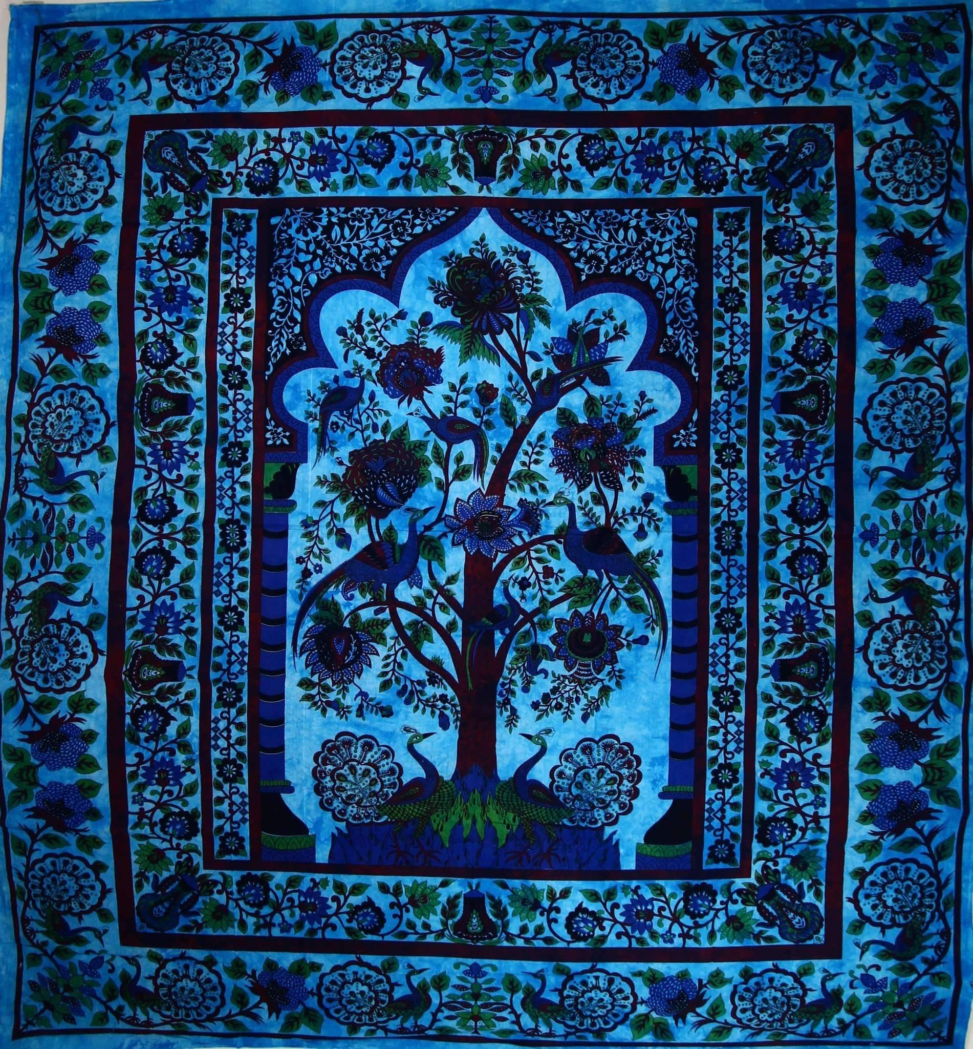 Grand tree of life tapestry displaying vibrant colors, intricate floral art extending past the borders. This design shows a beautiful view beyond a temple door with peacocks adorning this popular tree. Display as wall art, bed or table decorative covers or personal blankets! Bring them along at concerts and other outside events, it's all up to you!