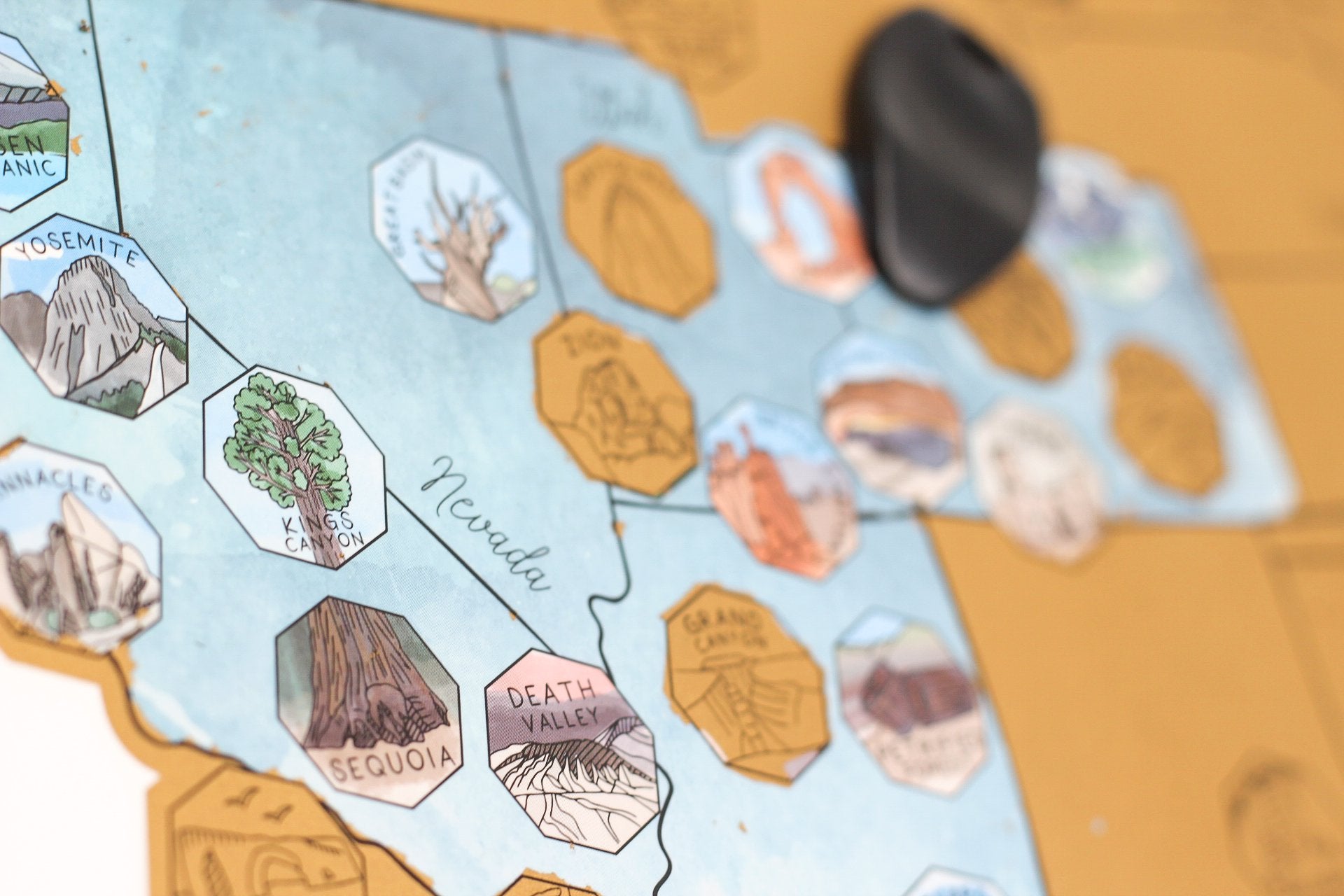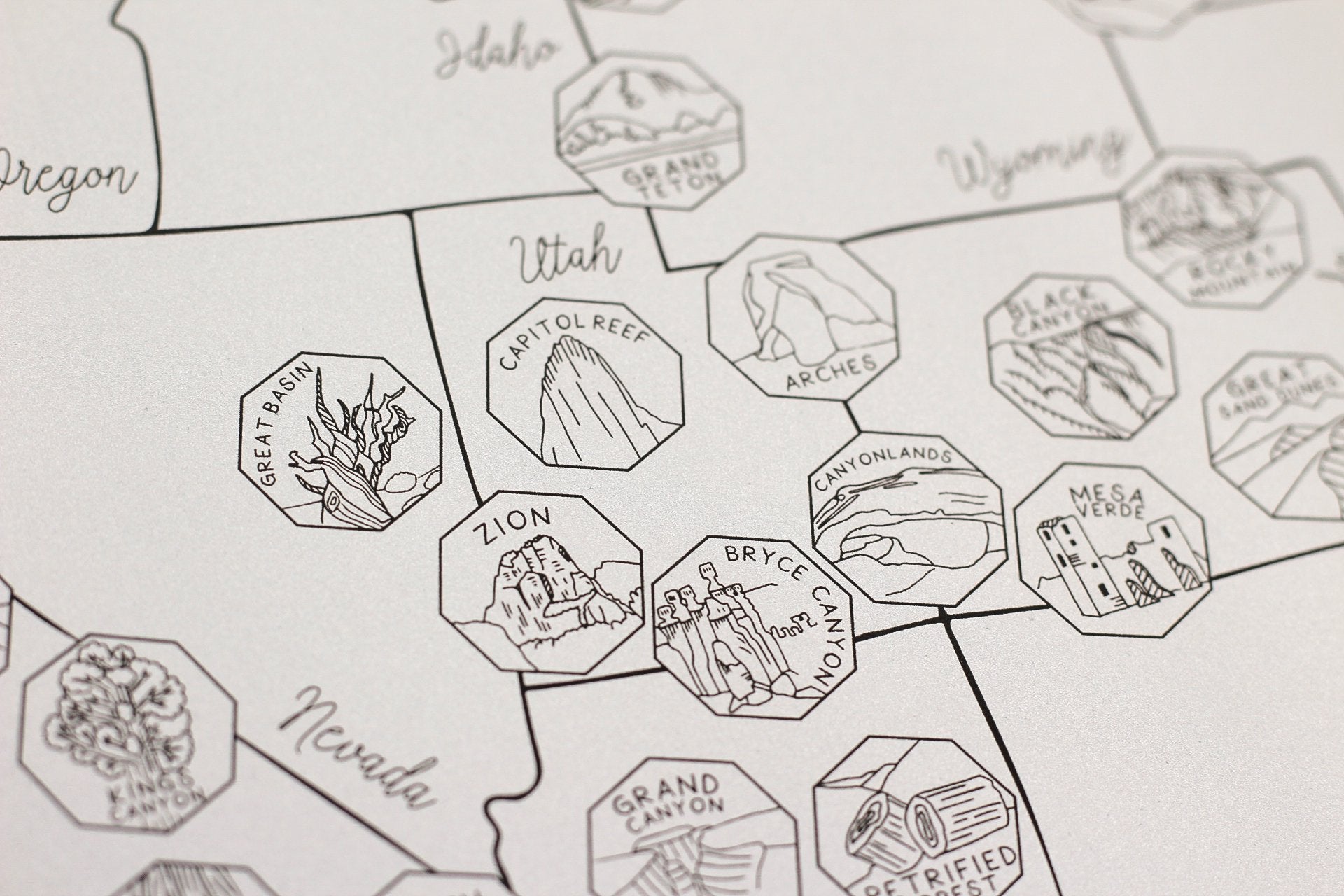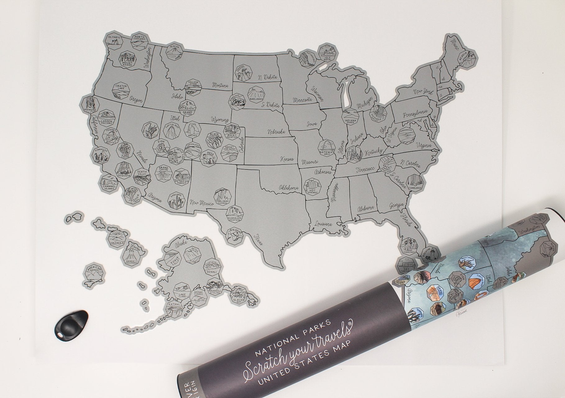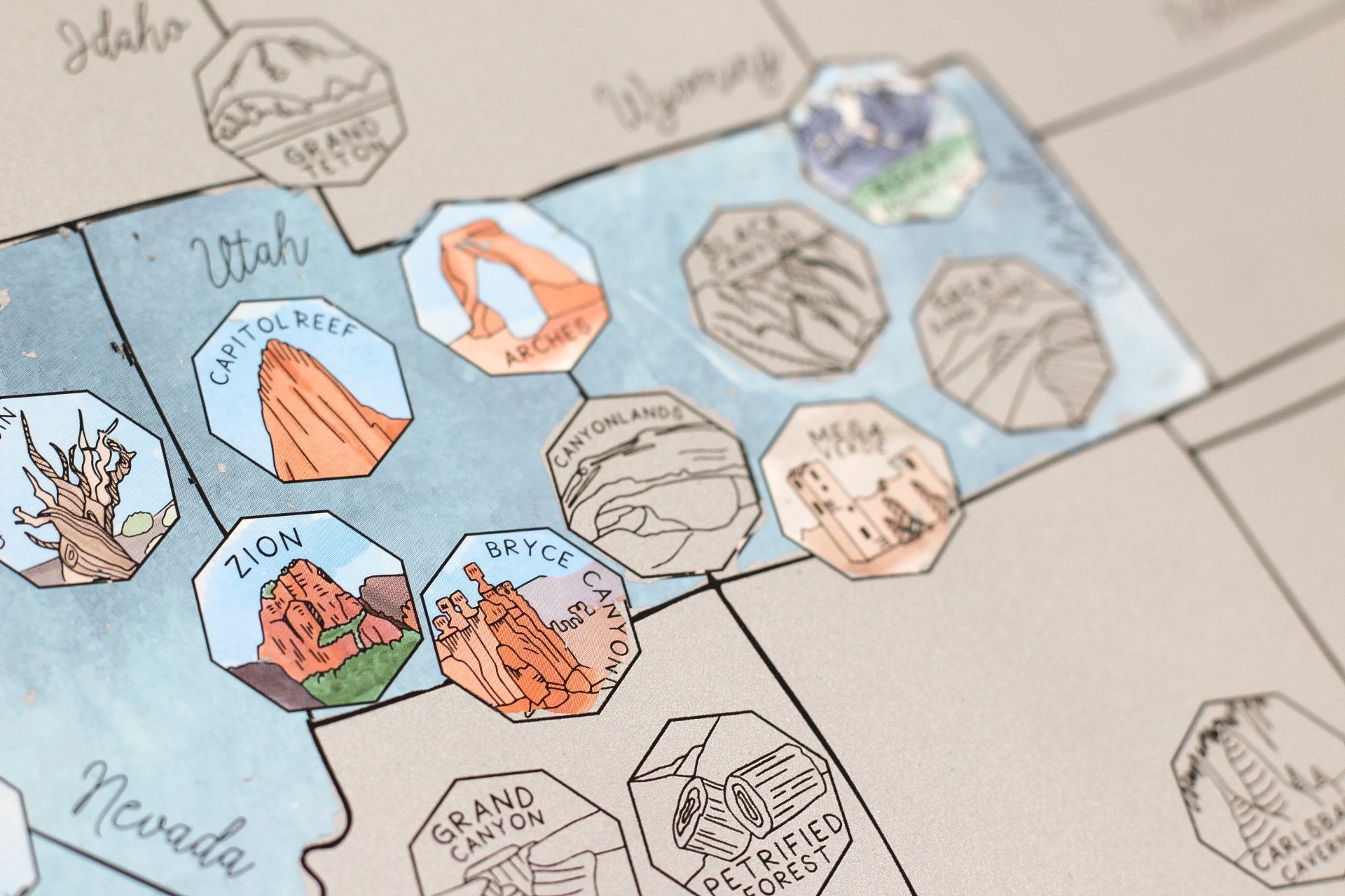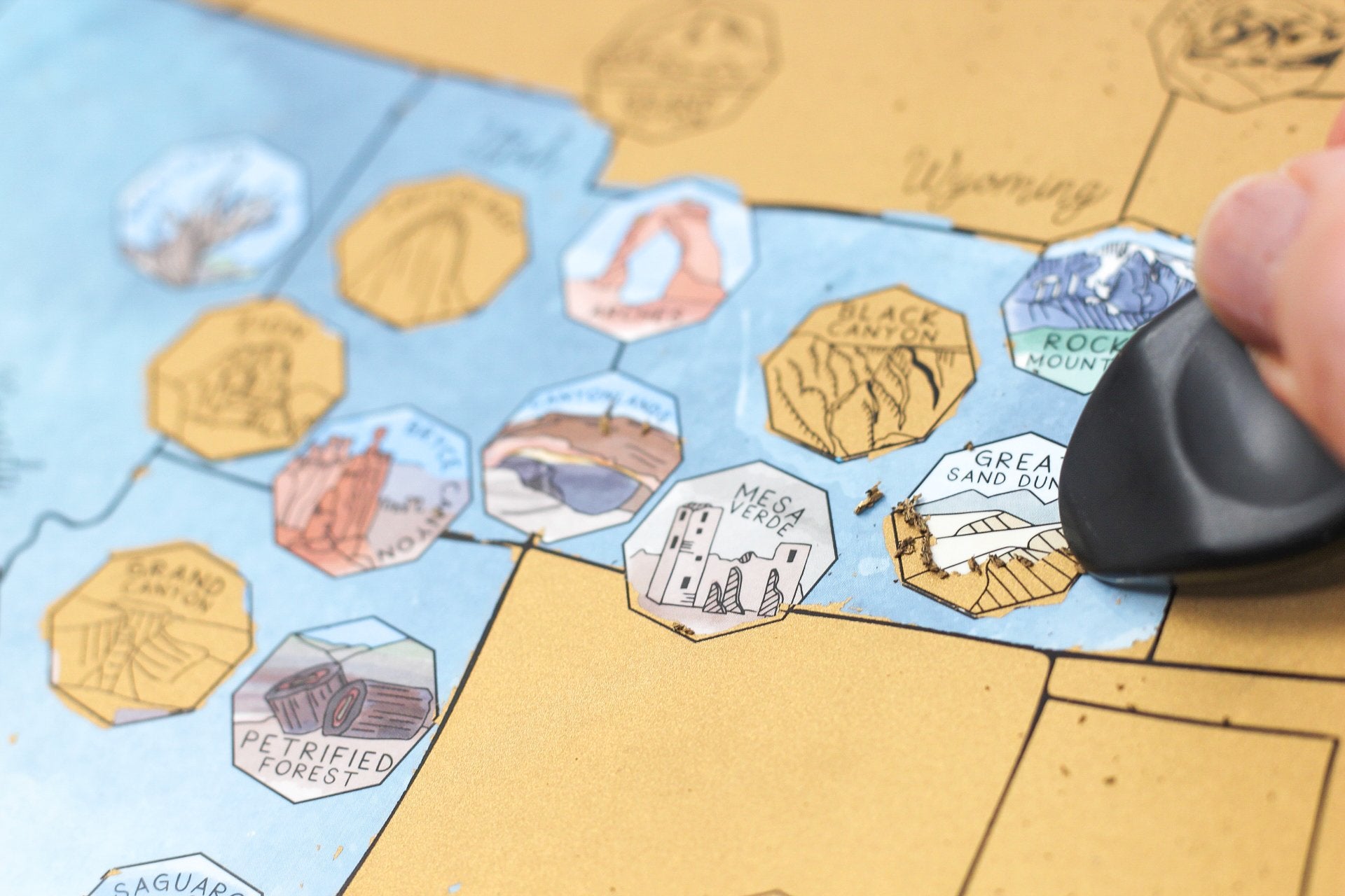 Includes 61 National Parks (including Indiana Dunes National Park that was added in early 2019). Each park is hard-drawn and shaped like a hexagon, making it easy to scratch more precisely. To use, simply use the included tool to scratch off the foil over states and national parks you've visited.