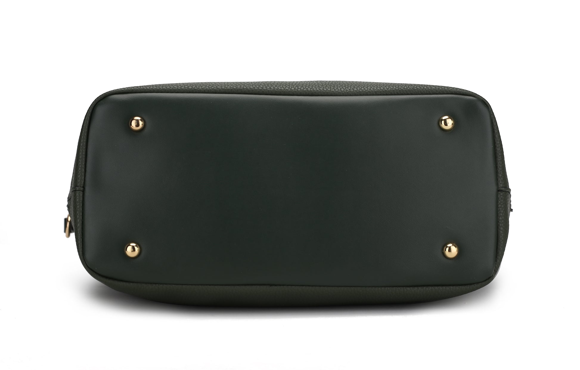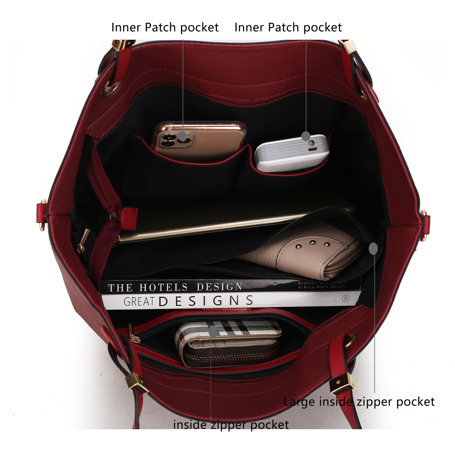 · Our Vallie carryall is the ultimate Tote bag for everyday wear. Crafted from color-block high-quality pebble vegan leather and designed with luxurious gold-tone embellishments, this softly structured bag will become your favorite everyday essential. Unzips the Vallie Tote Bag to reveal a fully lined interior with two slip pockets and a wall zippered pocket with room for everything you will need. The spacious design is complete with a padded center zip compartment. The exterior features a convenient back zippered pocket. The Vallie Tote Bag has a flat base and metal feet to keep the bag upright position. You can carry this versatile style on your shoulder by the top handle or attach the removable and adjustable strap and style it crossbody for hands-free ease. The Vallie Tote Bag has accented with our signature Mia K. Collection emblem keychain for decoration, and it comes with a matching wallet.