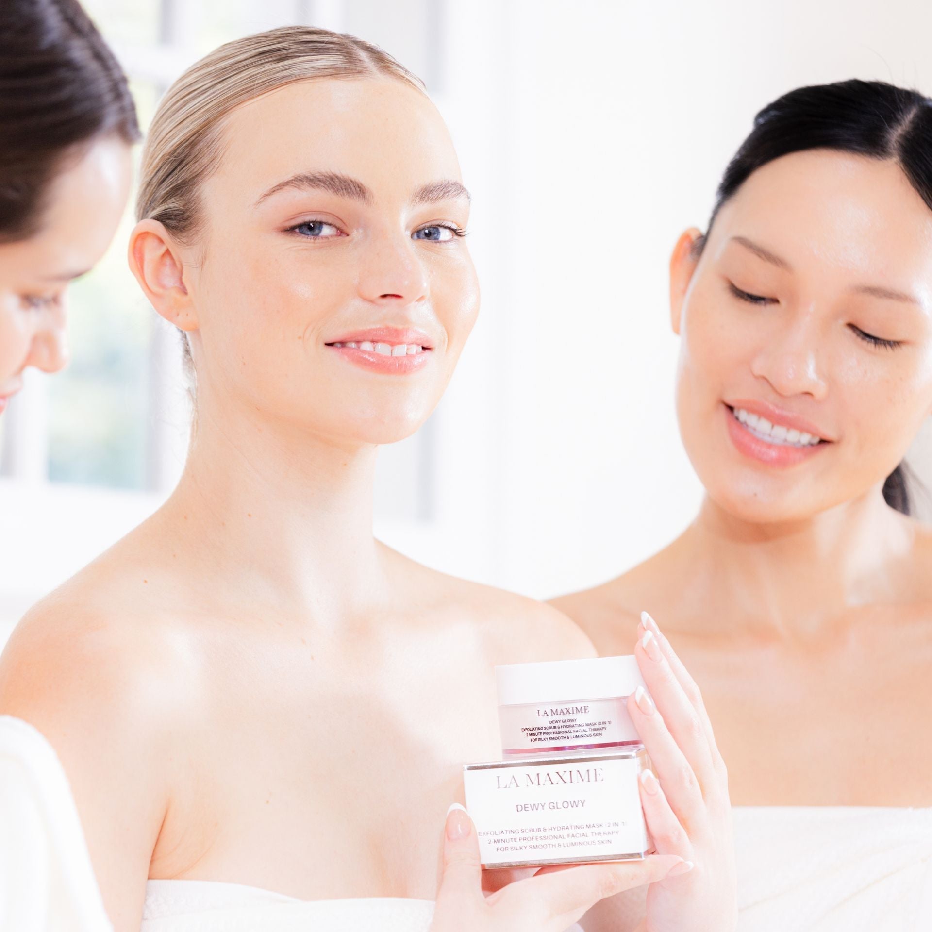 For mature skin, exfoliation is essential to help the skin renewal process by gently lifting the dead skin cells. Dewy Glowy is the latest 2-in-1, Exfoliating facial Scrub and Hydrating Mask in one jar. Unlike a Clay mask, it won't dry out or taunt your skin. It is highly effective and gentle to use daily. You will see fine lines and pigmentation escape, and your complexion will be evenly toned and translucent.