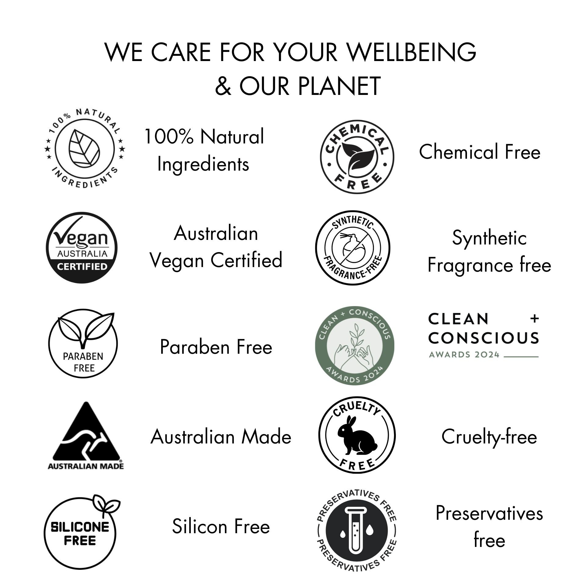 Aloe Barbadensis Leaf Juice*, Rosa Damascena (Rose) Distillate Water*, Glycerin*, Helianthus Annuus (Sunflower) Seed Oil*, Olea Europaea (Olive) Fruit Oil*, Vitis Vinifera (Grape) Seed Oil, Oryza Sativa (Rice) Extract*, Oryza Sativa (Rice) Flour, Ricinus communis Seed (Castor) Oil*, Oryza Sativa Bran Oil, Actinidia Chinensis (Kiwi) Fruit Extract, Syzygium Leuhmanii (Lilli Pilli) Fruit Extract, Polygonum Fagopyrum (Buckwheat) Seed Extract, Argania Spinosa Kernel (Argan) Oil*, Sclerocarya Birrea (marula) Seed Oil, Prunus Amygdalus Dulcis (Sweet Almond) Oil*, Cetyl Alcohol, Cetearyl Alcohol, Zinc oxide, Parfum (Naticide ®), Cetearyl Glucoside, Glyceryl Stearate, Lavandula Angustifolia (Lavender) Flower Extract. Santalum Spicatum (Australian Sandalwood) Oil*. * denotes ACO Certified Organic Ingredients